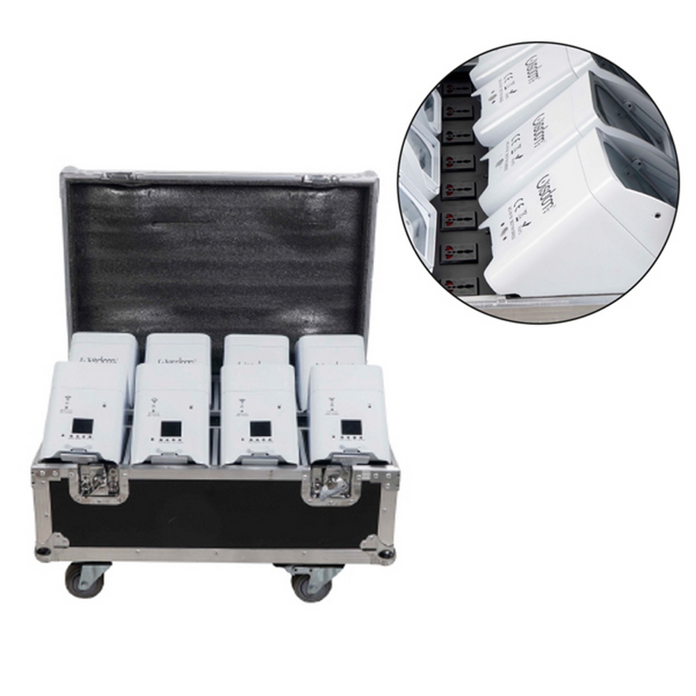 Set completo di 8 fari Led a batteria con baule rinforzato munito di ruote per il trasporto. Il baule è completo dei cavi per ricaricare tutti i fari. Le caratteristiche del singolo faro sono le seguenti: Faro a batteria con 6 Led da 18W (108W in totale), può emettere diverse tipologie di luci: RGB i tre colori primari Red (rosso), Green (verde), Blue (blu) e la loro combinazione, W si riferisce al bianco “puro” non ottenibile con la sola combinazione RGB, A ambra, il tipico colore dei fari alogeni con luce molto calda, UV che al buio evidenzia gli oggetti che riflettono questa tipologia di luce (molti oggetti bianchi, cosmetici, vaselina ecc.). Grazie alla sua autonomia (circa 8 ore), può essere utilizzato in molteplici situazioni senza preoccuparsi di avere una fonte di alimentazione nel posto in cui si vuole posizionare, inoltre non sono necessari cavi DMX in quanto accessoriato con telecomando IR e segnale WiFi a 2.4GHz. La scocca metallica è molto solida ed è facilmente trasportabile grazie alla maniglia retraibile. La ricarica della batteria avviene tramite la connessione Powercon blu ed è possibile collegare un altro faro tramite il rilancio Powercon grigio, la ricarica completa avviene in circa 3 ore e la scarica in circa 8 ore. Sono presenti anche le connessioni DMX IN e OUT XLR a 3 poli. Il faro funziona sia in manuale, miscelando i valori di RGBWAUV, che in automatico, sia con colori pre-miscelati che con giochi di luce, è possibile seguire il tempo della musica tramite il microfono interno.