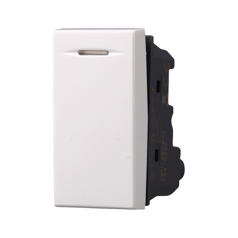 Il deviatore 1 polo 1 modulo ad innesto 16A di colore bianco con comando basculante e predisposizione per indicatore a luce led, serie moon della marca Ettroit, è compatibile con la serie civile BTicino Axolute.