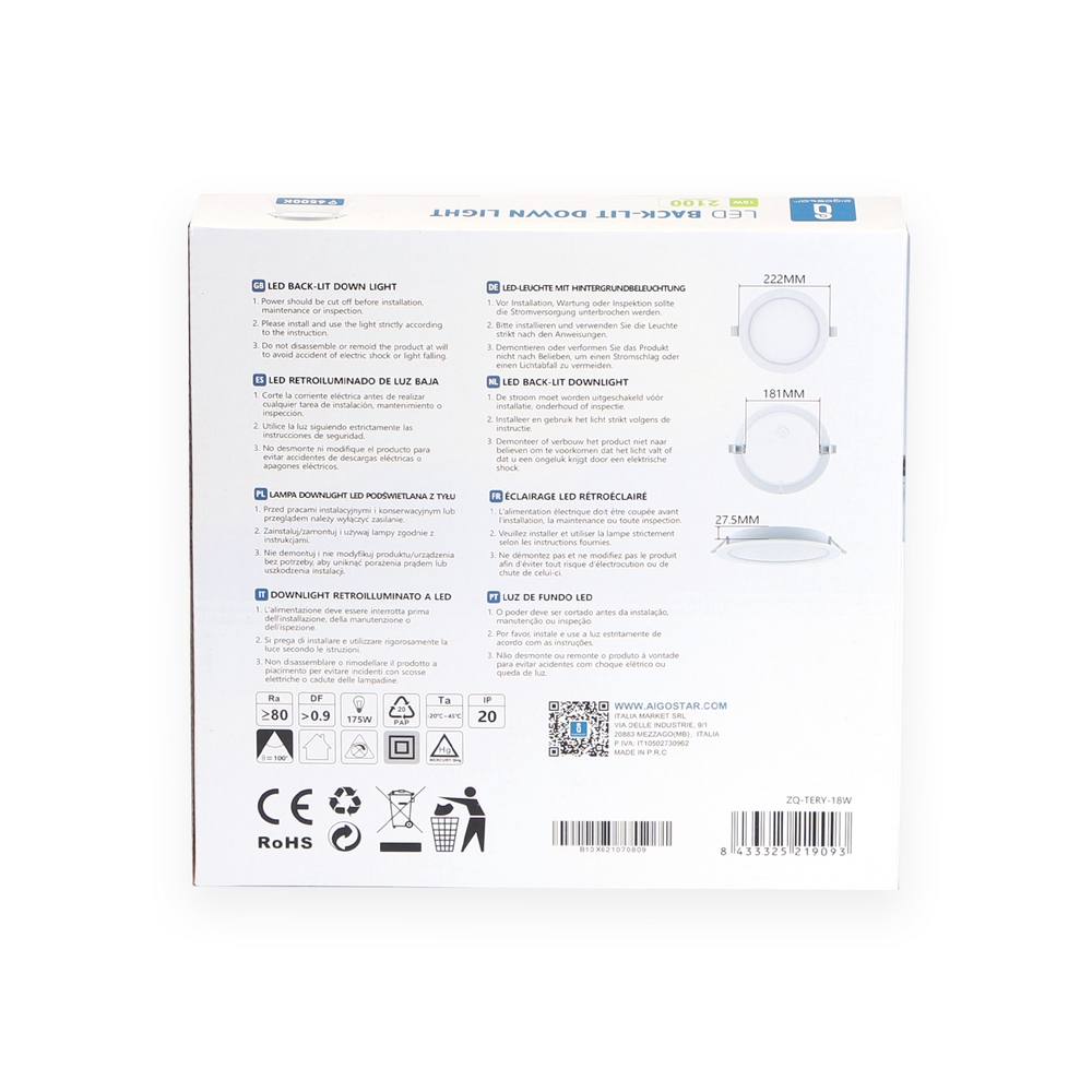 Faretto Led slim da incasso 18W Rotondo Cornice bianca Apertura 100 gradi Bianco freddo 6500K Aigostar