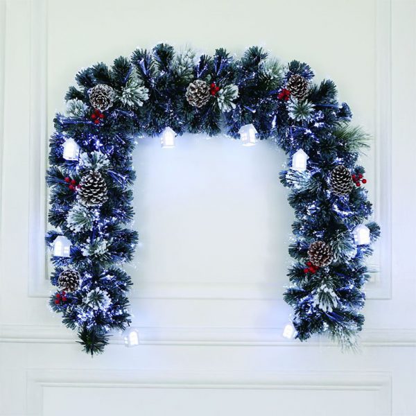 Il cuore di questo festone è l’integrazione di casette illuminate, distribuite lungo la ghirlanda e perfettamente inserite nel contesto, come se spuntassero da un paesaggio innevato. L’illuminazione è resa ancora più magica dalla fibra ottica, che dona un effetto scintillante e dinamico, esaltato dai 8 giochi luminosi selezionabili.