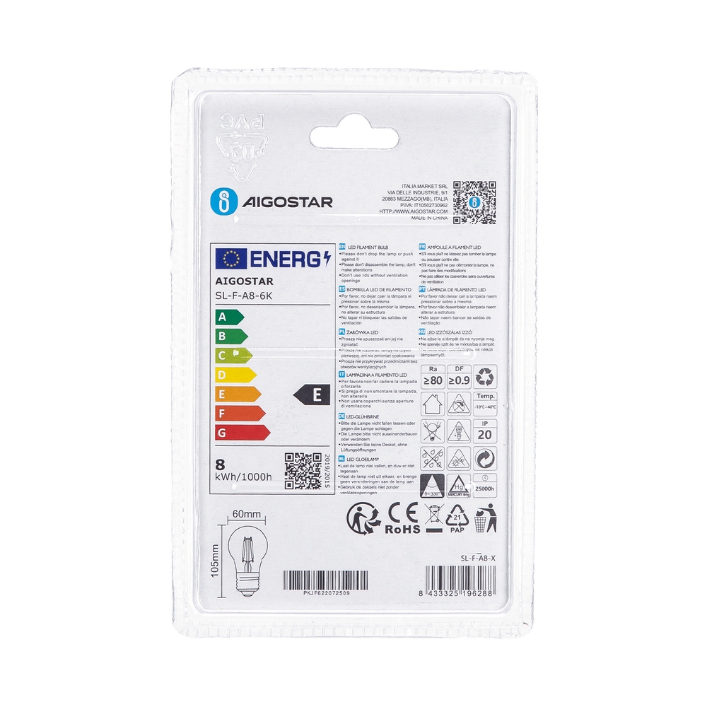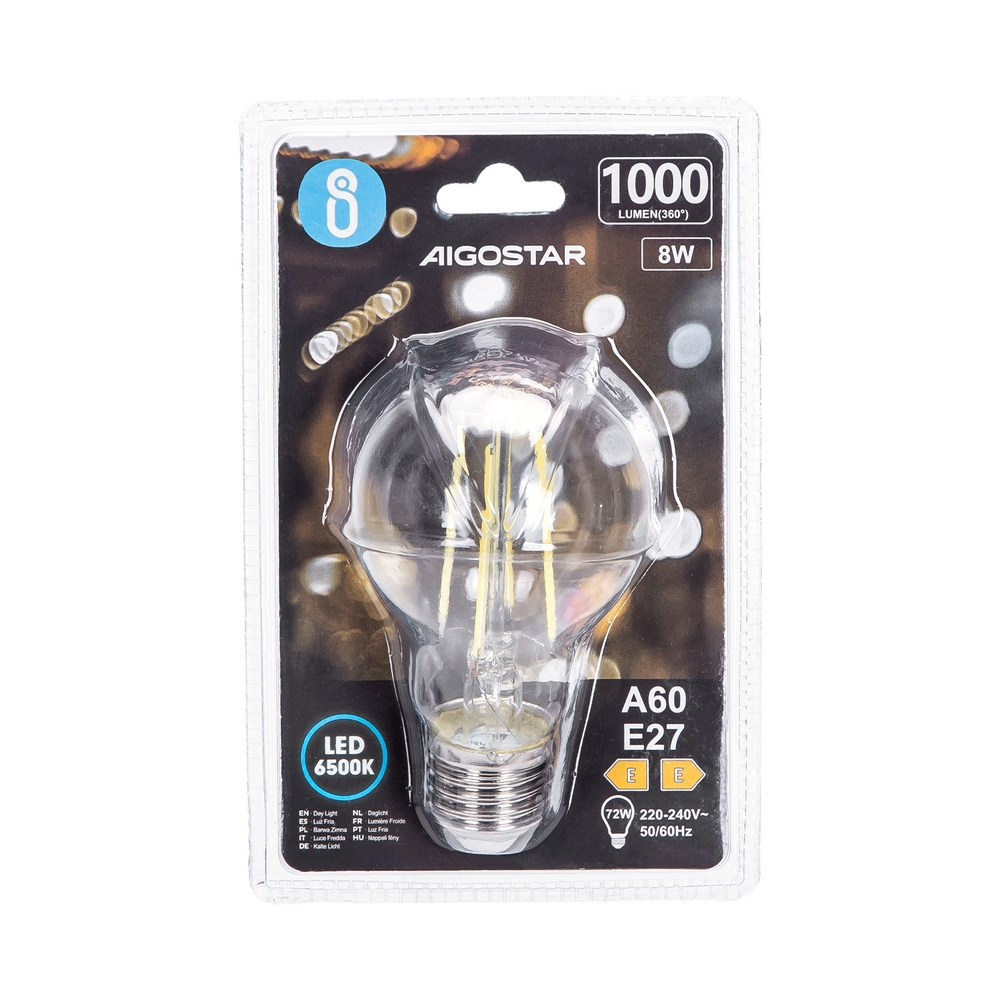 La lampadina a Led a Filamento con attacco E27, comunemente detto “attacco grande”, con forma A60 a bulbo da 8W, corrispondente ad una tradizionale lampadina da 75W, è il bilanciamento perfetto tra prestazioni e impatto energetico.