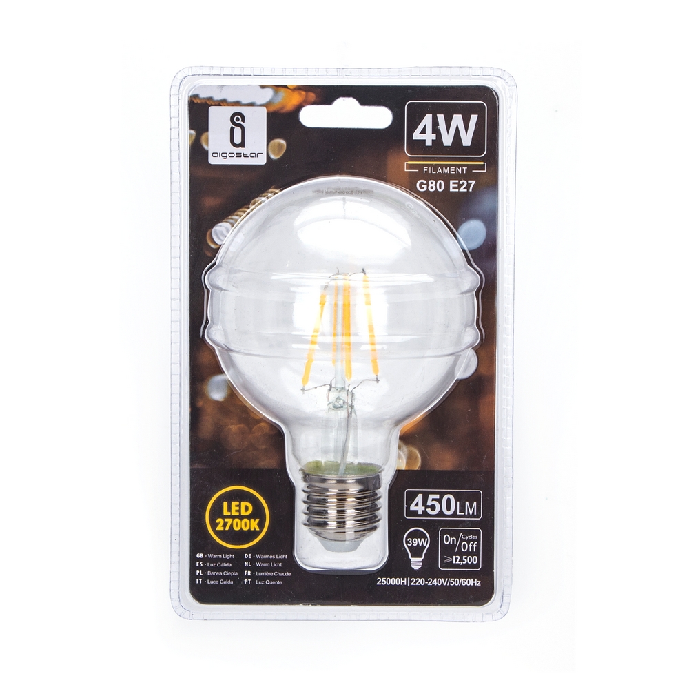 La lampadina a Led a Filamento con attacco E27, comunemente detto “attacco grande”, con forma G80 a globo 4W, corrispondente ad una tradizionale lampadina da 40W, è la miglior soluzione per contenere i consumi e non intaccare le prestazioni.