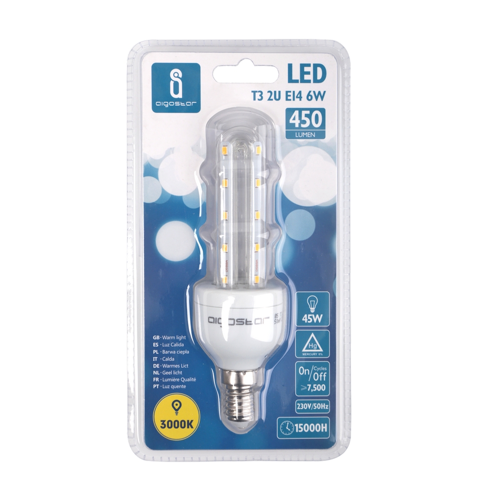 La lampadina a Led con attacco E14 comunemente detto “attacco piccolo” a tubo a U 6W, corrispondente ad una tradizionale lampadina da 39W, è il bilanciamento perfetto tra prestazioni e impatto energetico.