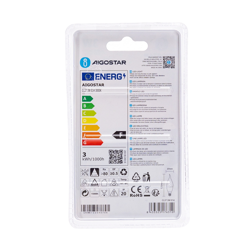 Lampadina Led E14 CL37 a colpo di vento 3W Bianco caldo 3000K Aigostar