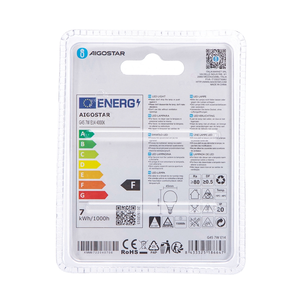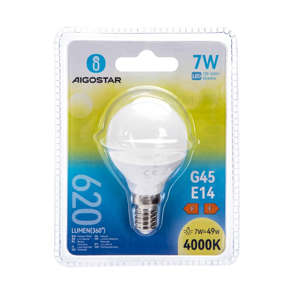 Lampadina Led E14 G45 a sfera 7W Bianco neutro 4000K Aigostar