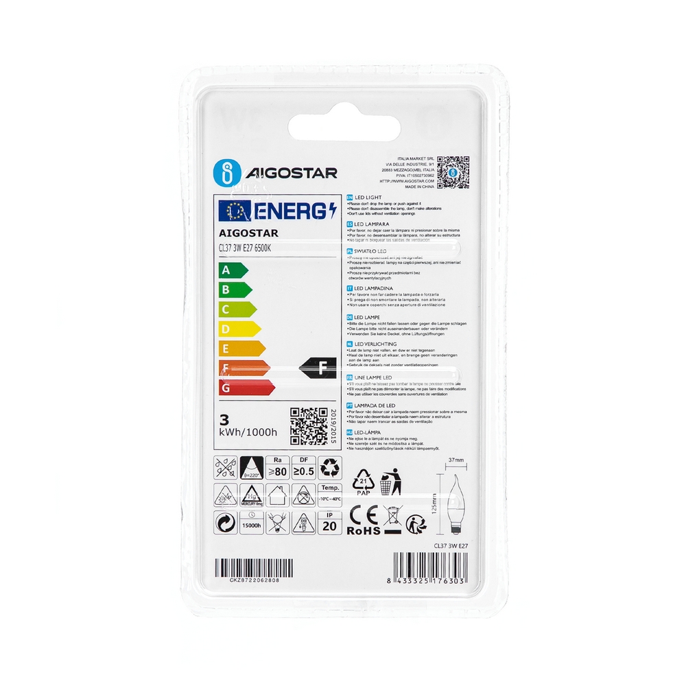 La lampadina a Led con attacco E27, comunemente detto “attacco grande”, con forma CL37 a colpo di vento 3W, corrispondente ad una tradizionale lampadina da 25W, è la miglior soluzione per contenere i consumi e non intaccare le prestazioni.