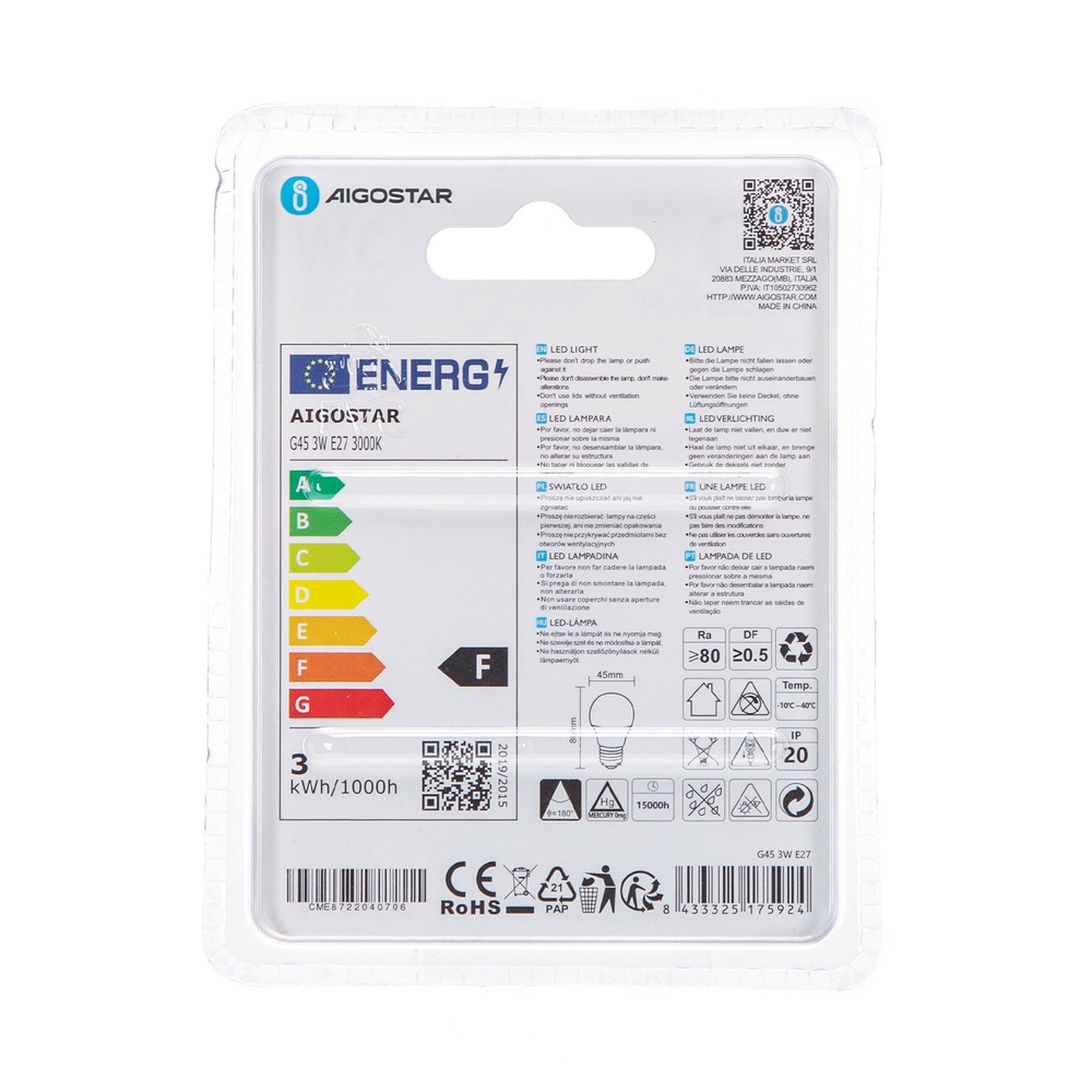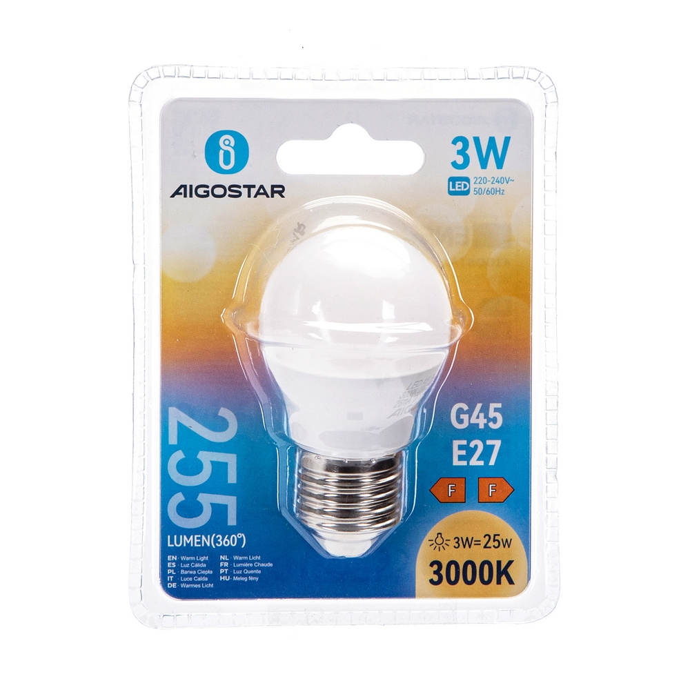 La lampadina a Led con attacco E27, comunemente detto “attacco grande”, con forma G45 a sfera 3W, corrispondente ad una tradizionale lampadina da 25W, è la miglior soluzione per contenere i consumi e non intaccare le prestazioni.