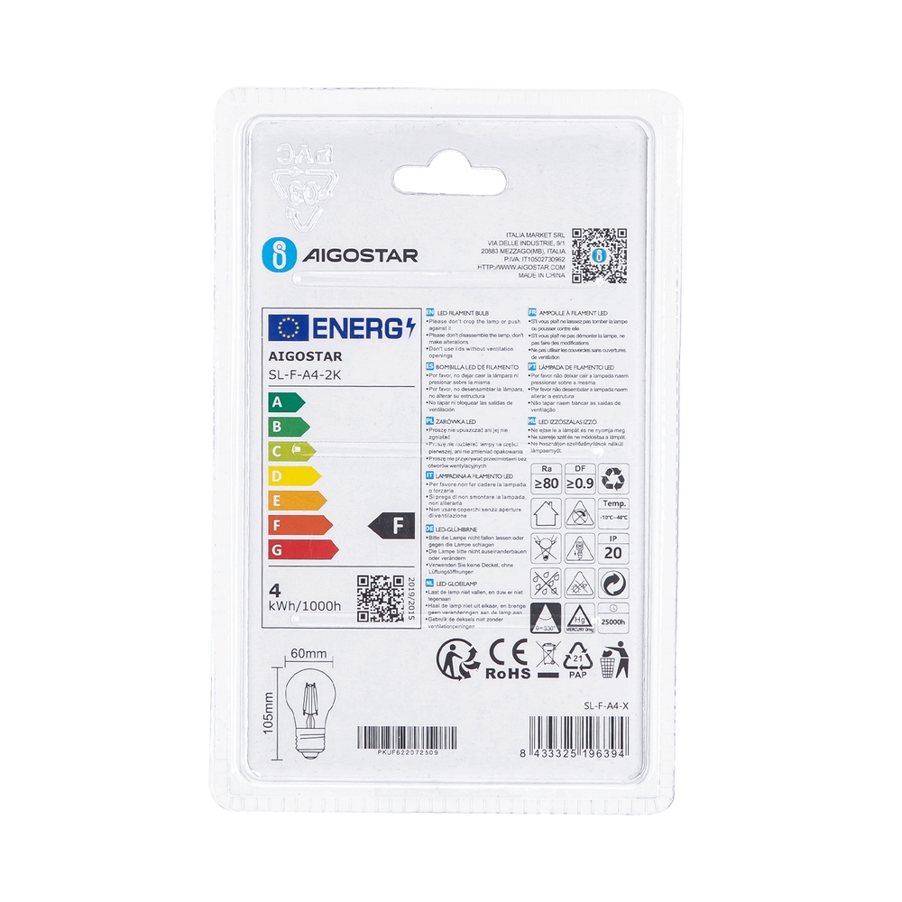 Con una sorgente luminosa da 430 lumen, la lampadina è perfetta per illuminare piccoli ambienti o per creare atmosfera con una luce morbida e soffusa. La luce emessa dalla lampadina è di alta qualità grazie al suo indice di resa comatica (CRI) ≥80 ed ha un angolo di apertura del fascio luminoso di 330°.