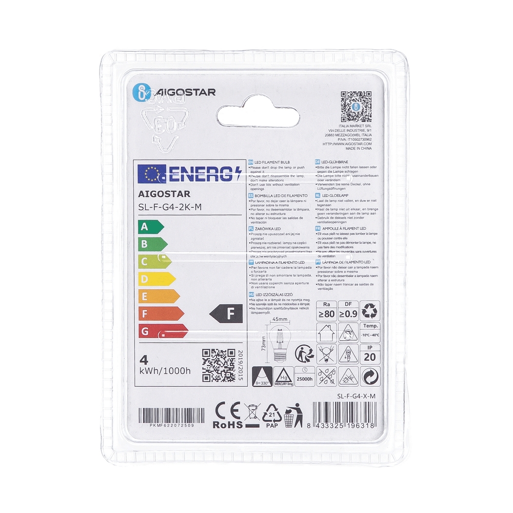 Con una sorgente luminosa da 400 lumen, la lampadina è perfetta per illuminare piccoli ambienti o per creare atmosfera con una luce morbida e soffusa. La luce emessa dalla lampadina è di alta qualità grazie al suo indice di resa comatica (CRI) ≥80 ed ha un angolo di apertura del fascio luminoso di 330°.