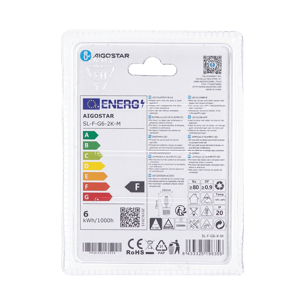 Lampadina Led Vintage a Filamento E27 G45 a sfera 6W Bianco caldo 2200K Aigostar