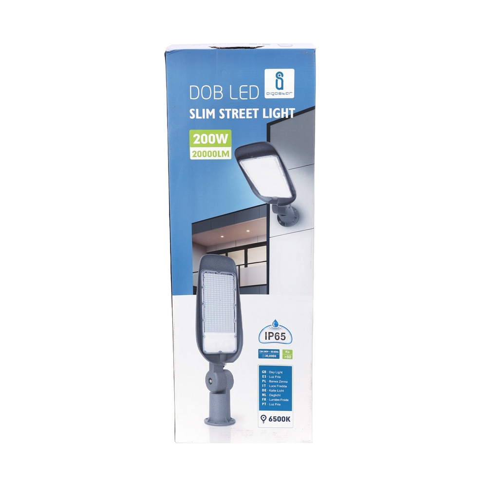 Il lampione emette un fascio di luce fredda da 130°x75° dalla potenza di 200W, il che garantisce il massimo dell’energia raggiungibile nella categoria. Questo modello, costruito in alluminio di colore grigio, può essere utilizzato all’esterno perché protetto totalmente dalle polveri e dai getti d’acqua, oltre ad avere un grado di resistenza agli urti pari a IK07. Il diametro del foro per fissare il lampione su un pale è di 54 mm.