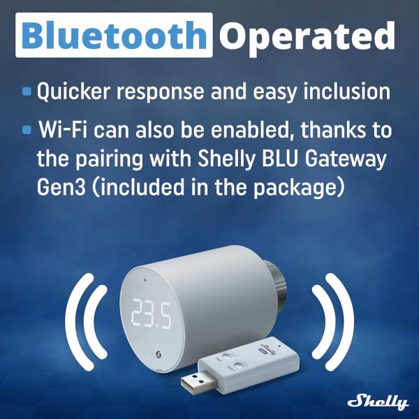 Con il BLU Gateway Gen3 incluso, puoi gestire la valvola termostatica in modo ancora più efficiente e programmare il riscaldamento in base alle tue esigenze quotidiane. La pianificazione intelligente consente di impostare temperature diverse durante la giornata, garantendo ambienti sempre accoglienti e un notevole risparmio energetico. Inoltre, la compatibilità con i sensori Shelly BLU H&T e Shelly BLU Door/Window (tramite gateway) assicura un’integrazione avanzata per un controllo ancora più preciso.