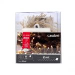 MicroLed impermeabili per presepi, bottiglie, vasi, caminetti, alberi di natale ed ogni tipo di decorazione che si voglia illuminare o che non sia raggiungibile da corrente elettrica, filo di colore argento con parte terminale di colore verde, 200 Microled diametro 5mm distanti 10 cm l’uno dall’altro, Temperatura Colore Bianco Caldo, alimentato da 4 batterie AA (non incluse), con 8 giochi luminosi selezionabili tramite il controller, lunghezza totale di 2 metri di cui 30 cm per la distanza tra presa e luci. Il prodotto è per uso interno con possibilità di uso esterno solo se il controller non è direttamente esposto ad agenti atmosferici. Grado di protezione IP44.
