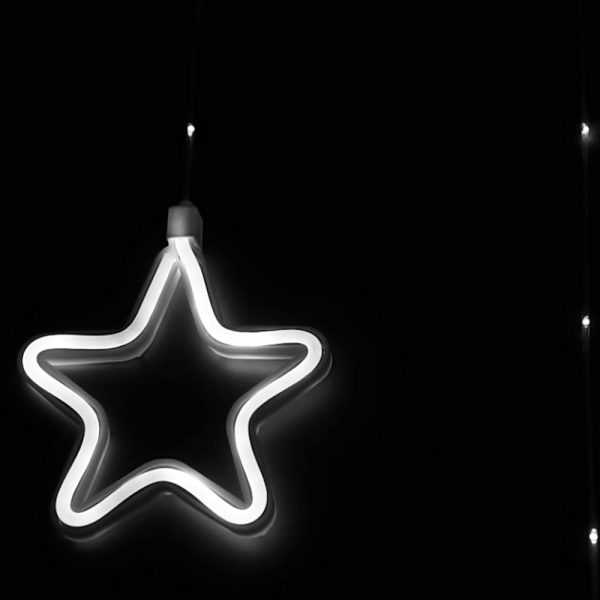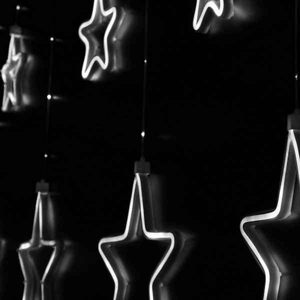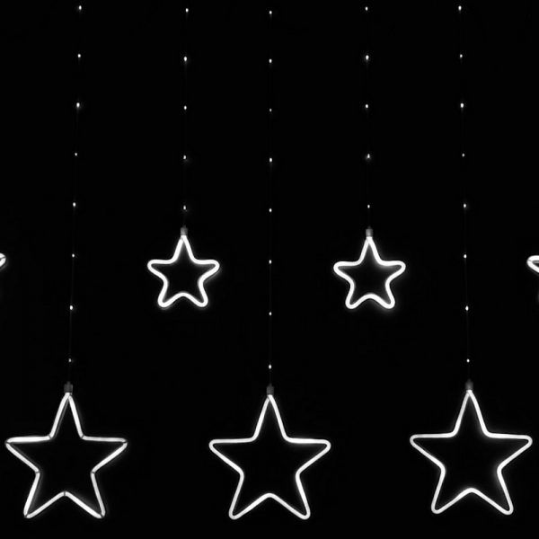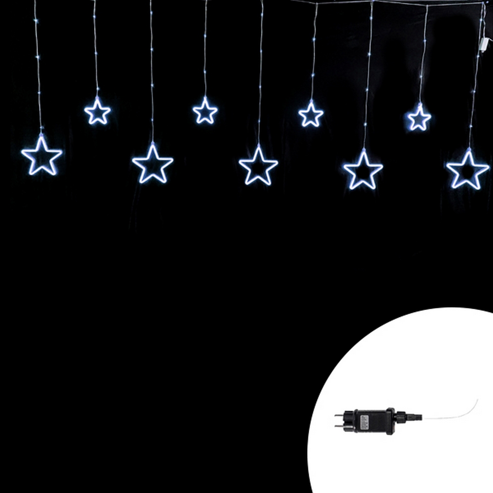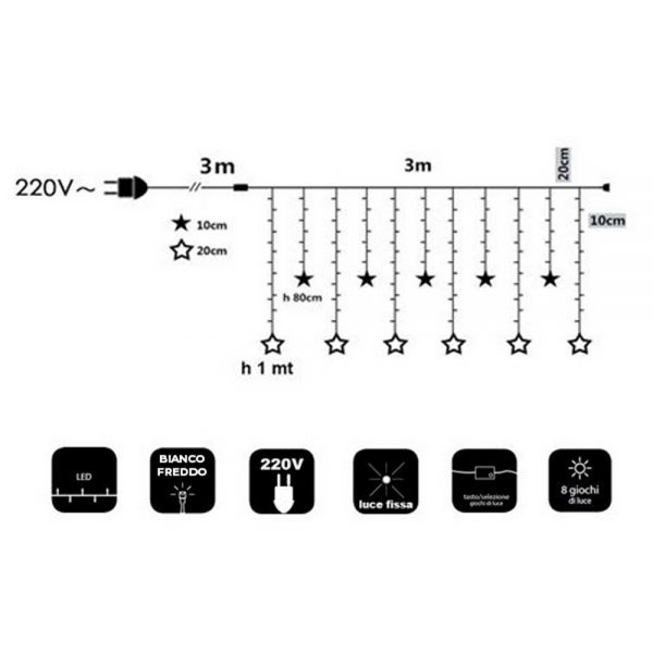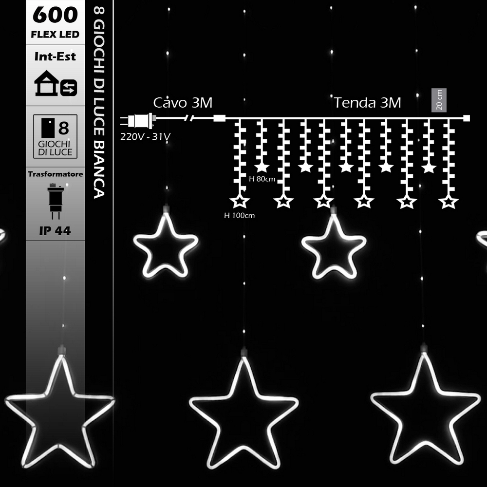 Tenda luminosa decorativa con stelle per addobbi natalizi, filo metallico, 600 Miniled diametro 5mm, per un totale di 9 stelle, Temperatura Colore Bianco Freddo, con 8 giochi luminosi, lunghezza 3 metri, distanza spina – luci 3 metri, 220V-240V, inoltre è prolungabile fino ad un massimo di 4 tende, 20 centimetri di distanza da ogni frangia che scende di diversa lunghezza.