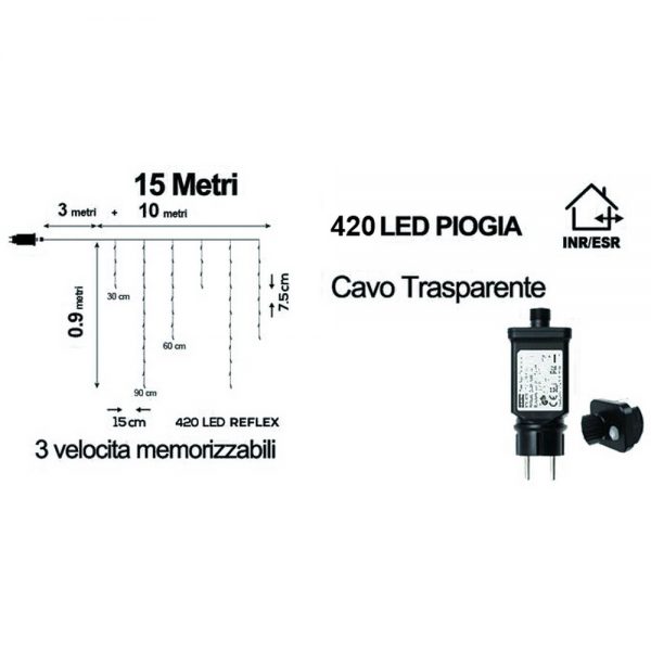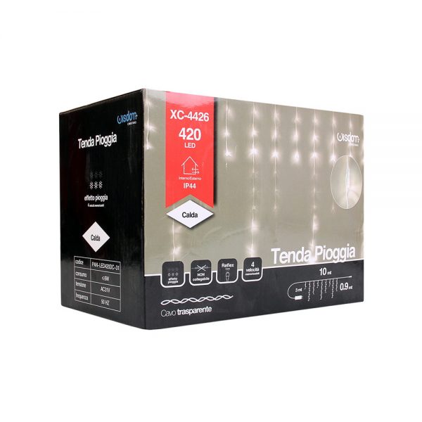 Il raffinato effetto pioggia è disponibile in 3 velocità selezionabili, per adattarsi allo stile e all’atmosfera desiderata: da un dolce scintillio a un ritmo più vivace. Progettata per l’uso esterno, questa tenda garantisce alte prestazioni, durata nel tempo e resistenza agli agenti atmosferici, anche in condizioni invernali.
