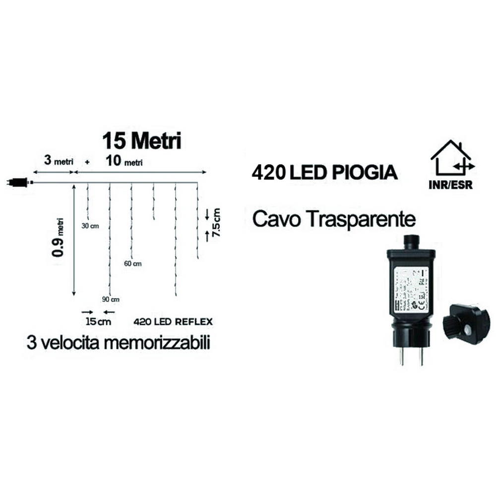 Lunga 10 metri e dotata di un cavo di alimentazione trasparente da 3 metri, questa tenda è composta da 420 MaxiLED Reflex ad alta luminosità, distribuiti lungo cadute alternate di 30, 60 e 90 cm. Il cavo trasparente si fonde perfettamente con ogni superficie, permettendo alla luce bianco freddo di risaltare con ancora più intensità e pulizia visiva.